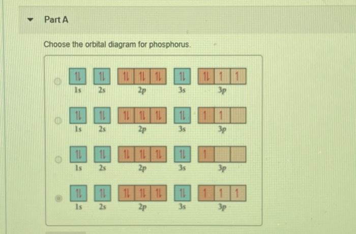 Part A Choose the orbital diagram for phosphorus. Since phosphorus is in the third group in the P block elements. 2 electrons in the.